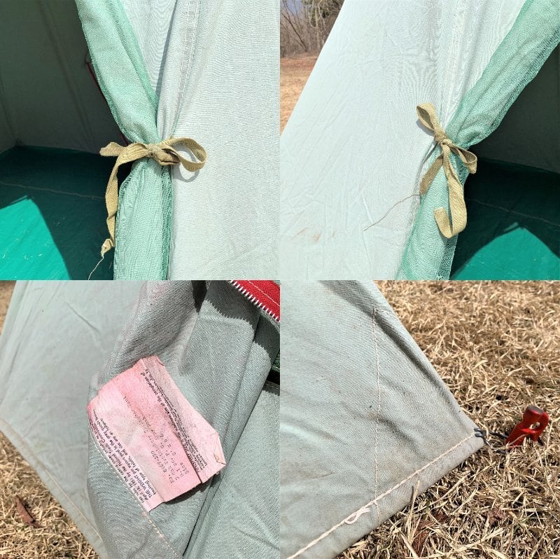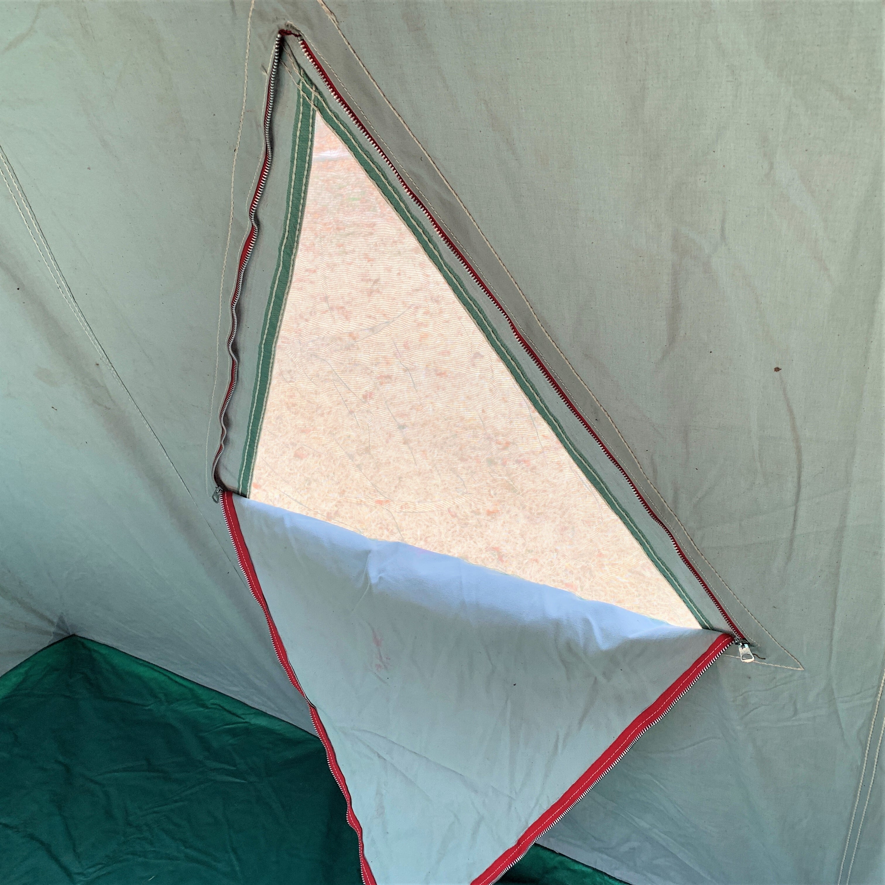テント幕本体はシミやヨゴレなど経年変化があります。大きなカビ、シミはありませんが製造されてからすでに60年を経過していますので使用に伴う軽度なヨゴレがあります。またこの年代特有のジッパー部(赤テープ)の幕本体への色移りが見受けられます。今後も雨天キャンプなど、どうしても幕が濡れてしまう時は色移りが起こりますのでお気を付けください。2ヵ所テント底面のグランドシートに引き裂き(約2mmほど)が見られます。グラウンドシート裏面から補修テープなどでのリペアはしておりませんが、そのままでもお使いになれると思います。