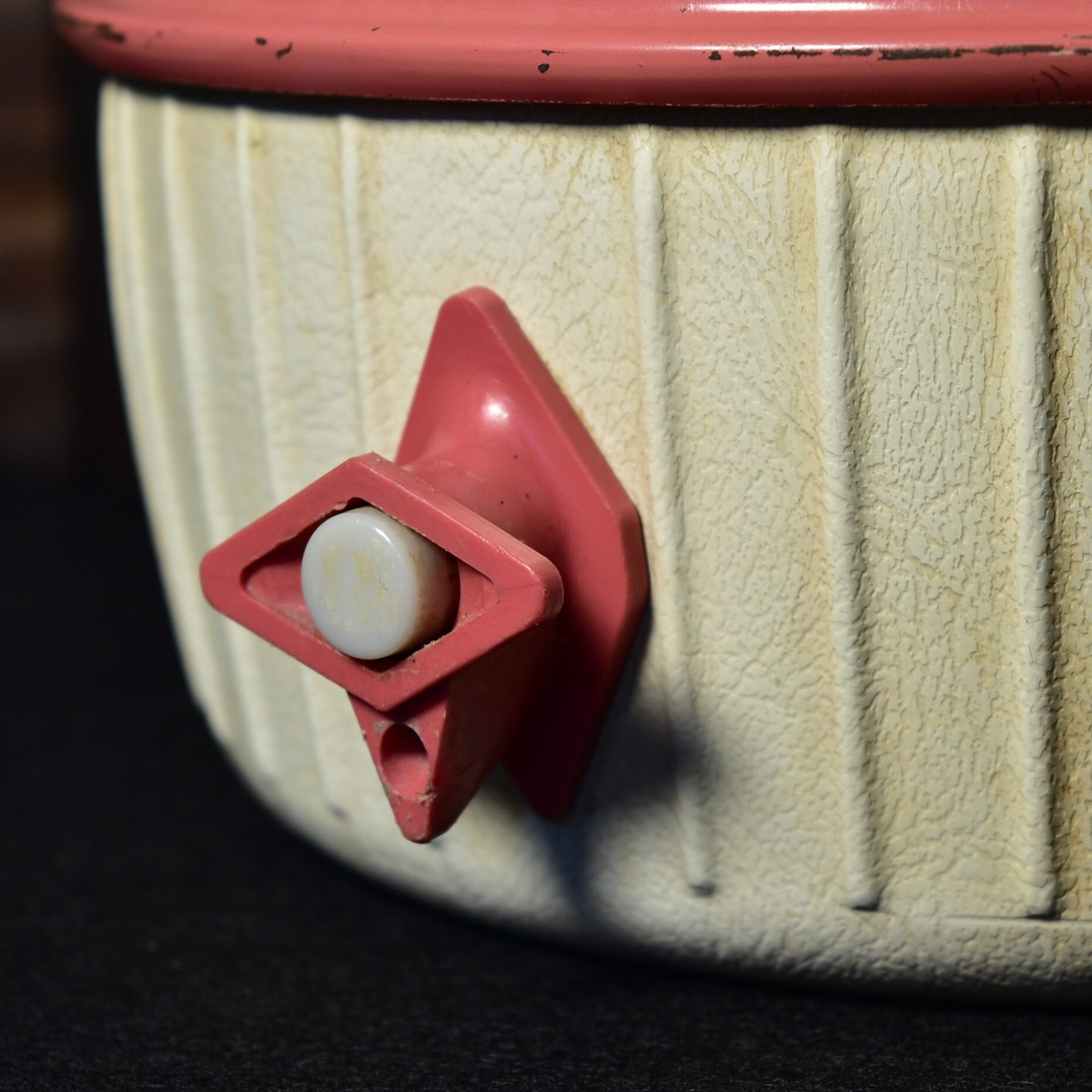 1960年代のダイヤモンドロゴのウォータージャグになります。ピンクと言っても少し濃いめの、はっきりしたピンクでサイトではひときわ目を惹く存在ですね。1960年代、パテントペンディング期のものです。ダイヤモンドロゴ期のウォータージャグで、仕入れ時に気を付けていることは全体的な状態はもちろんですが、持ち手部分の塗装剥がれや、サビです。どうしても稼働部なので状態が悪い商品が多いですが、こちらは比較的きれいと言えると思います。