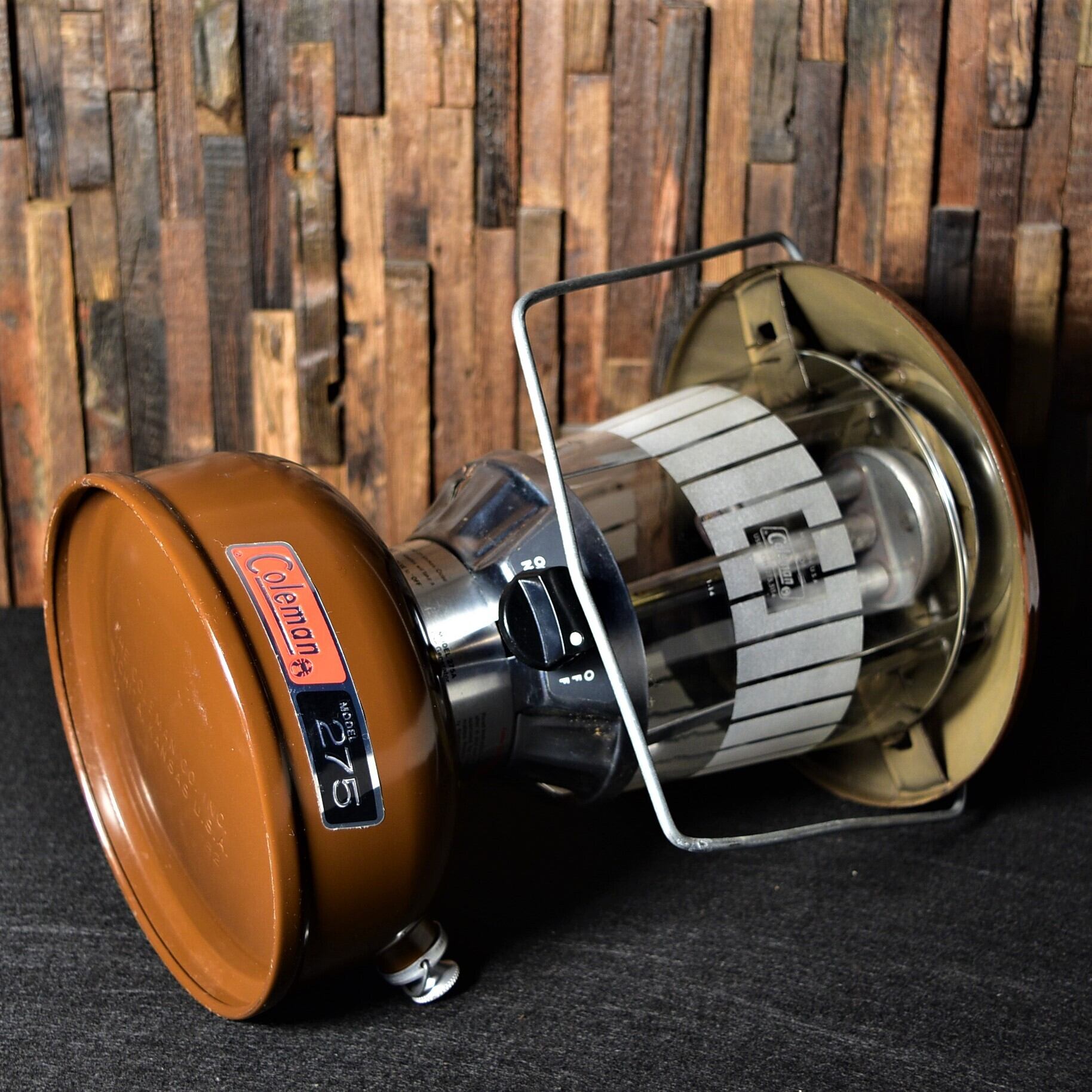 コールマンのビンテージツーマントルランタンの代表モデルと言えば、220系と228系ですが、実は同時期に隠れた名品として275が存在していました。グリーンの220系228系に対してオイルタンク、ベンチレータ共にブラウン、またグローブの形状が台形型という一風変わったデザインに、275の人気の理由があったようです。