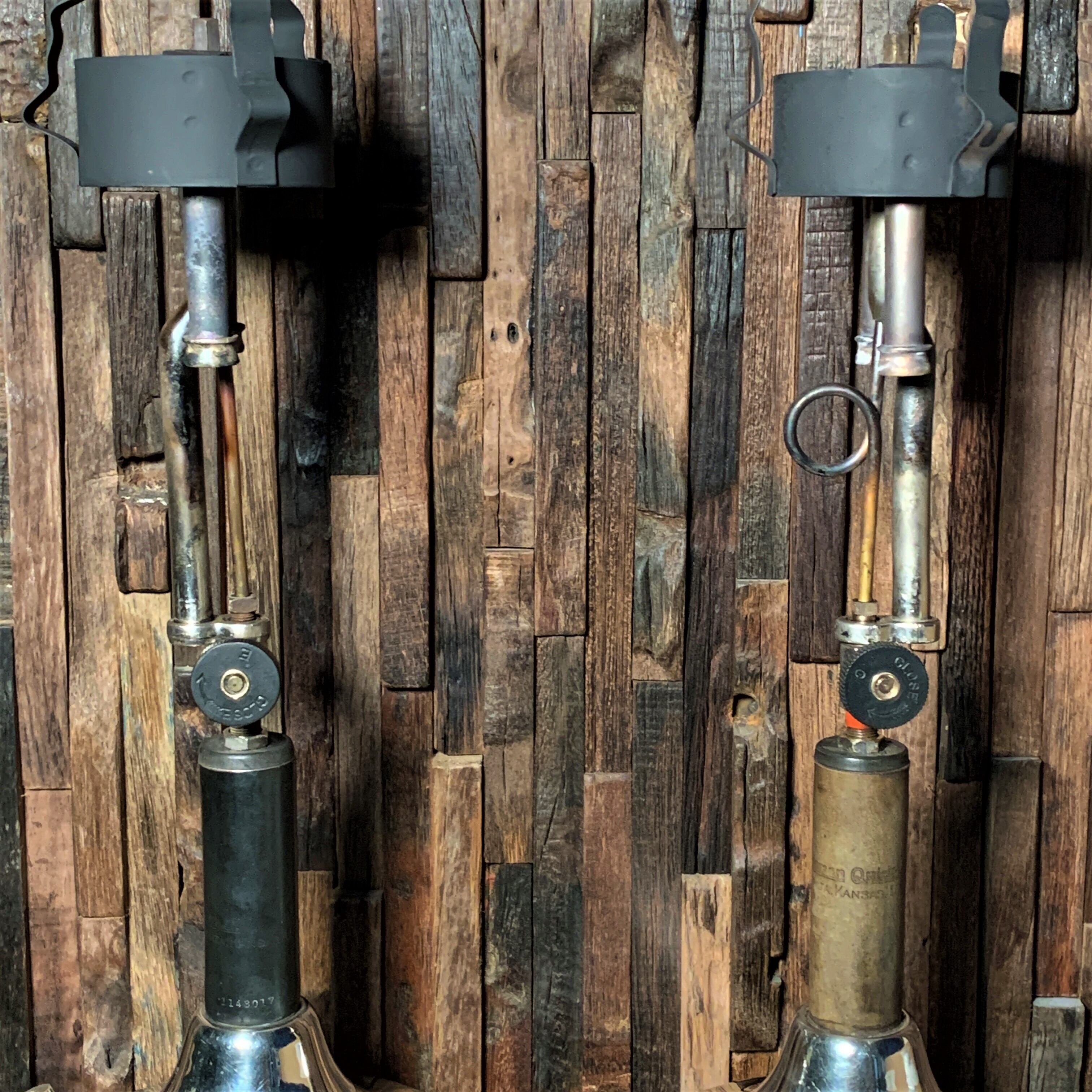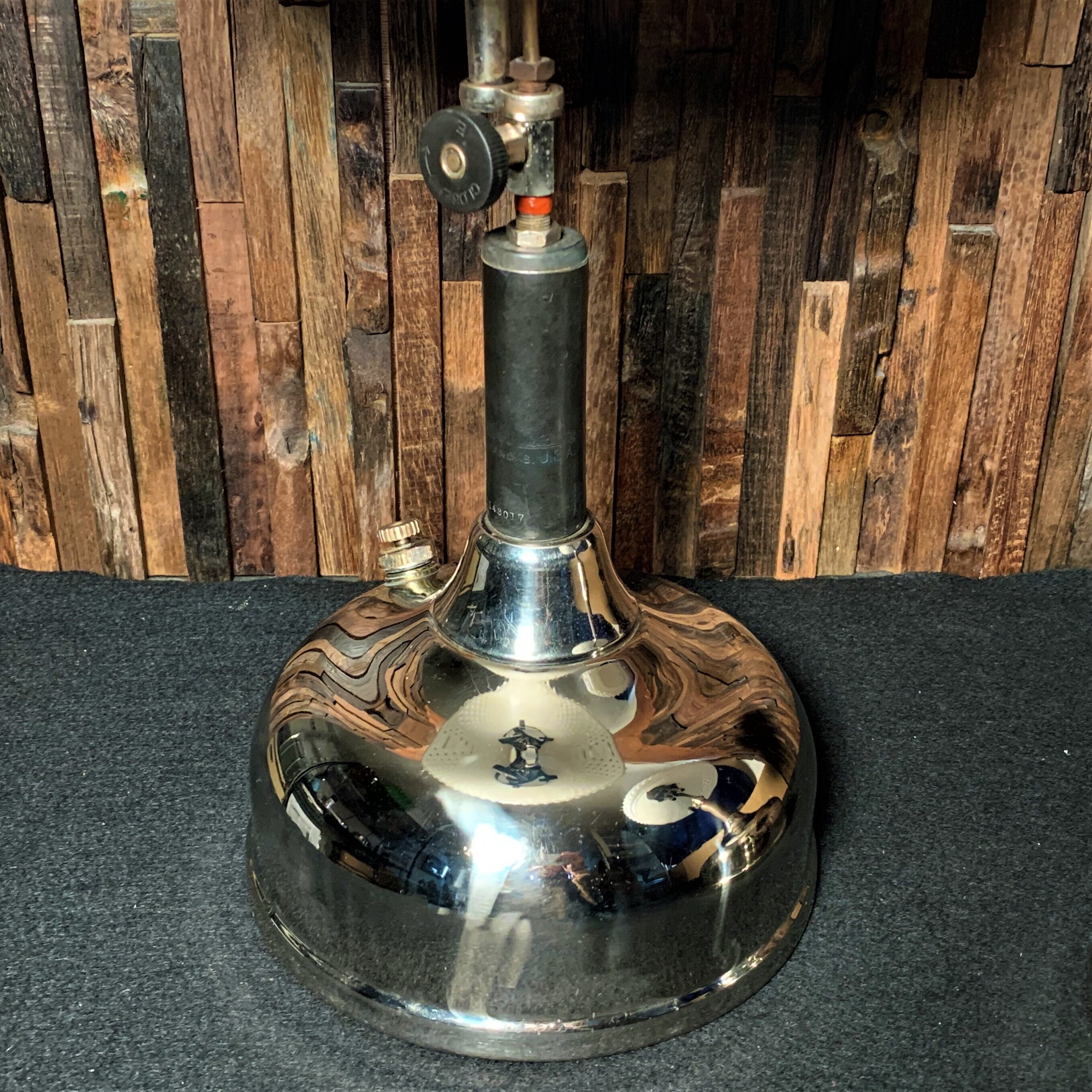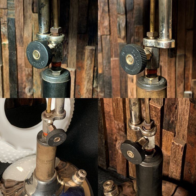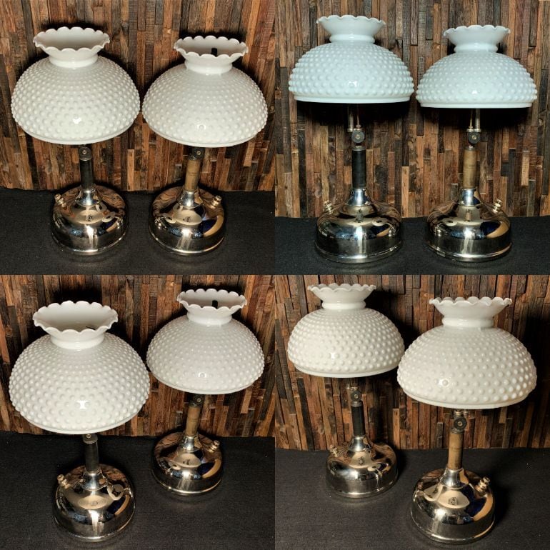 今回はアメリカ製329型シルバータンクとホワイトオパールのホブネイルガラスシェードをそれぞれ組み合わせてセットにしております。テーブルランプ本機は両方ともに完全分解後、磨きをかけてメンテナンスを施してあります。メッキタンクには鏡面仕上げをしてあります。それぞれ1時間ほど点火確認してありますが、ちらつきもなく燃焼良好です。