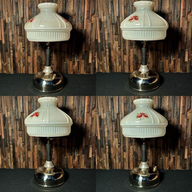 今回はCQ329シルバータンクと、花柄プリントがかわいいガラスシェードを組み合わせております。テーブルランプ本体は分解後、磨きをかけてメンテナンスを施してあります。メッキタンクには鏡面仕上げをしてあり大変きれいな状態です。1時間ほど点火確認してありますが、ちらつきもなく燃焼良好です。
