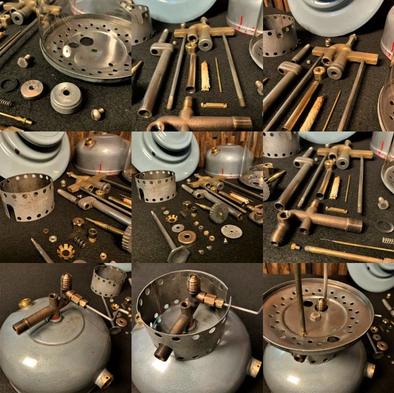 コールマンでいう228系とベンチレーターを共有していますが、タンク径、機関部などは別構造となります。さまざまな変更点がありますが、もっとも大きい変更点はバーナー周りがすべて鋳型であることだと感じます。バーナーチューブがすべて一体型の鋳物のため重厚感があります。またジェネレーターは同年代のコールマンに比べると太く、それもあってか燃焼音も大きいです。チップクリーナーの突出部分やポンププランジャーも特異でこのランタンならではです。