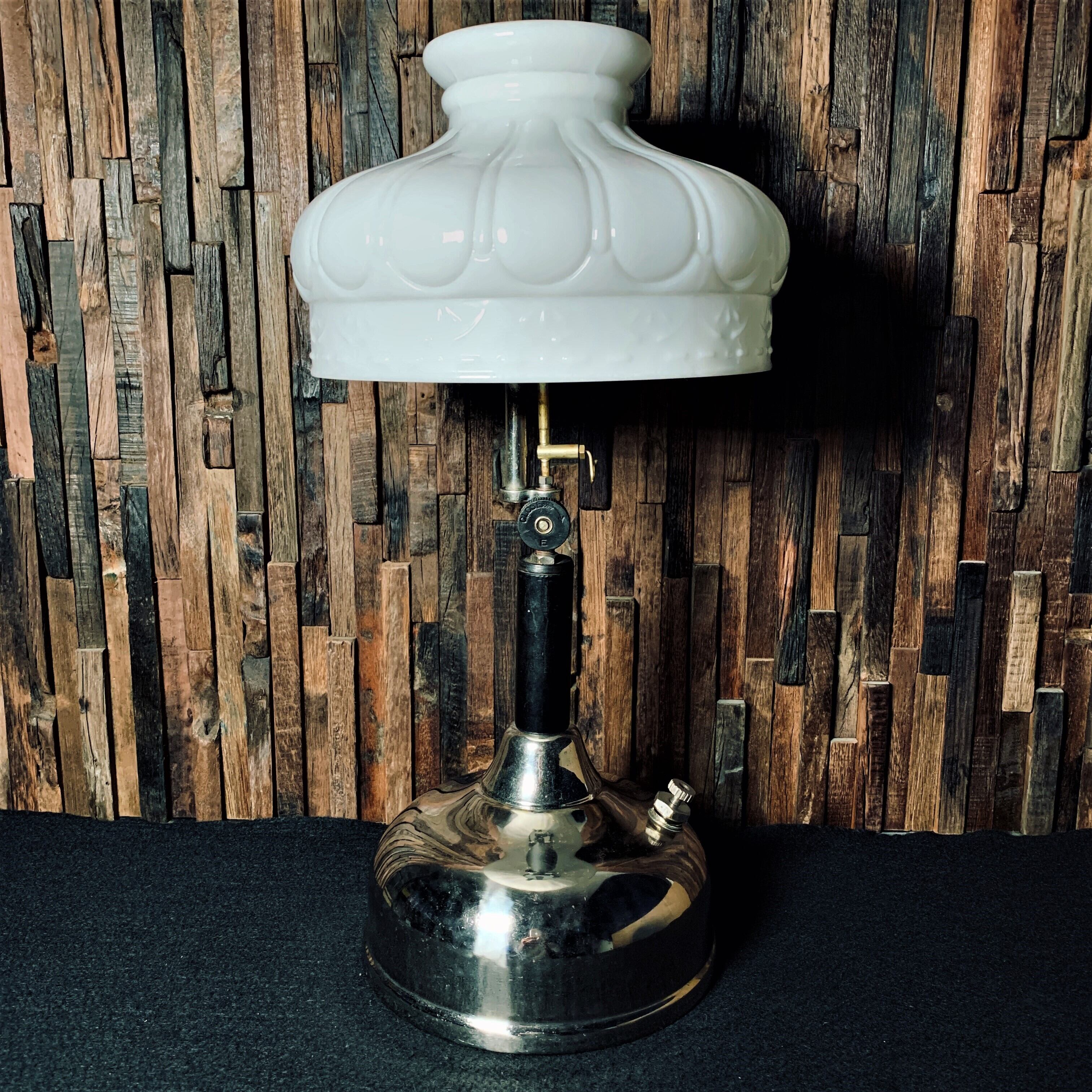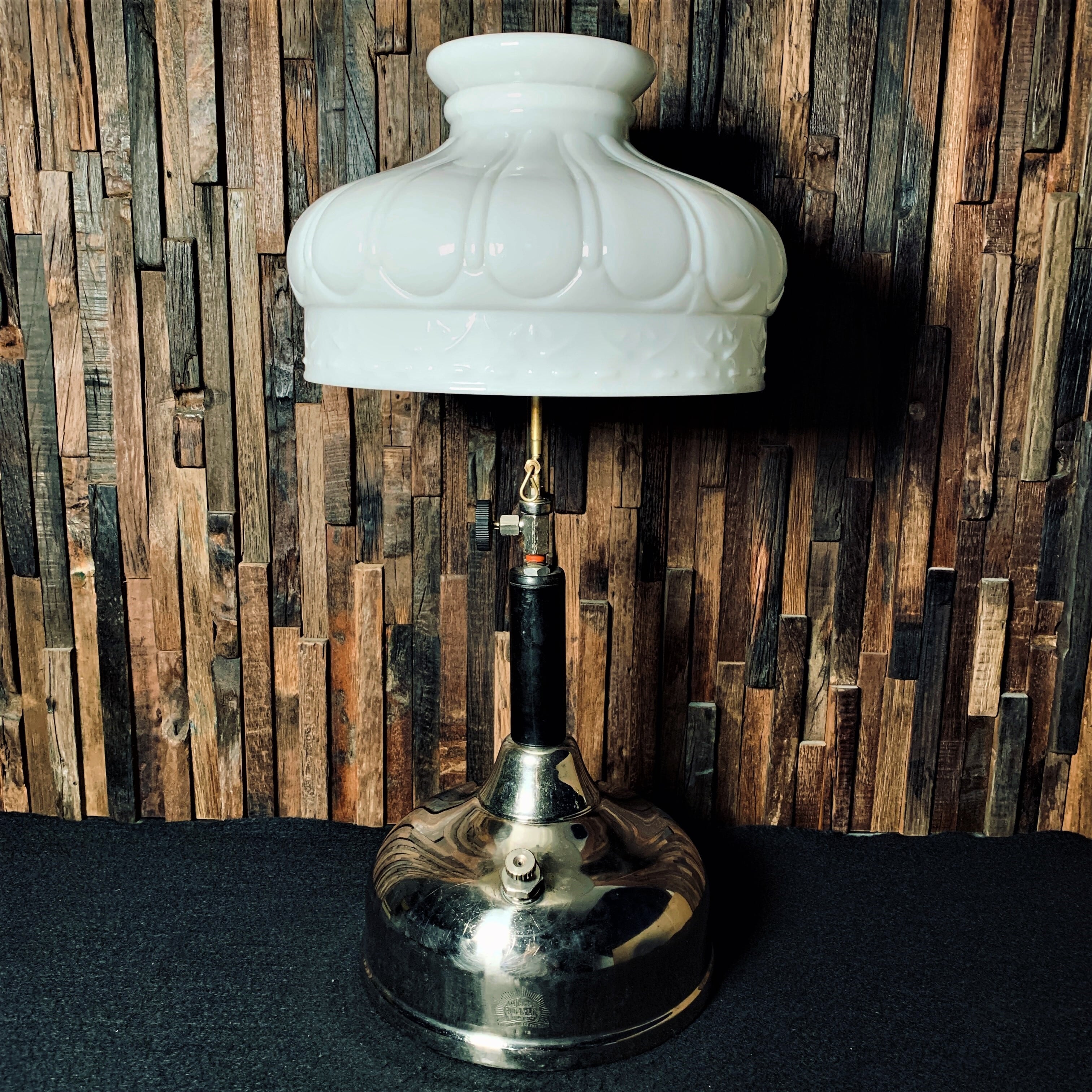 コールマン クイックライト ビンテージ テーブルランプ オリジナルシェード CQ329 ホワイトオパール ミルクシェード 完全分解清掃 点火良好 鏡面仕上げ シルバー