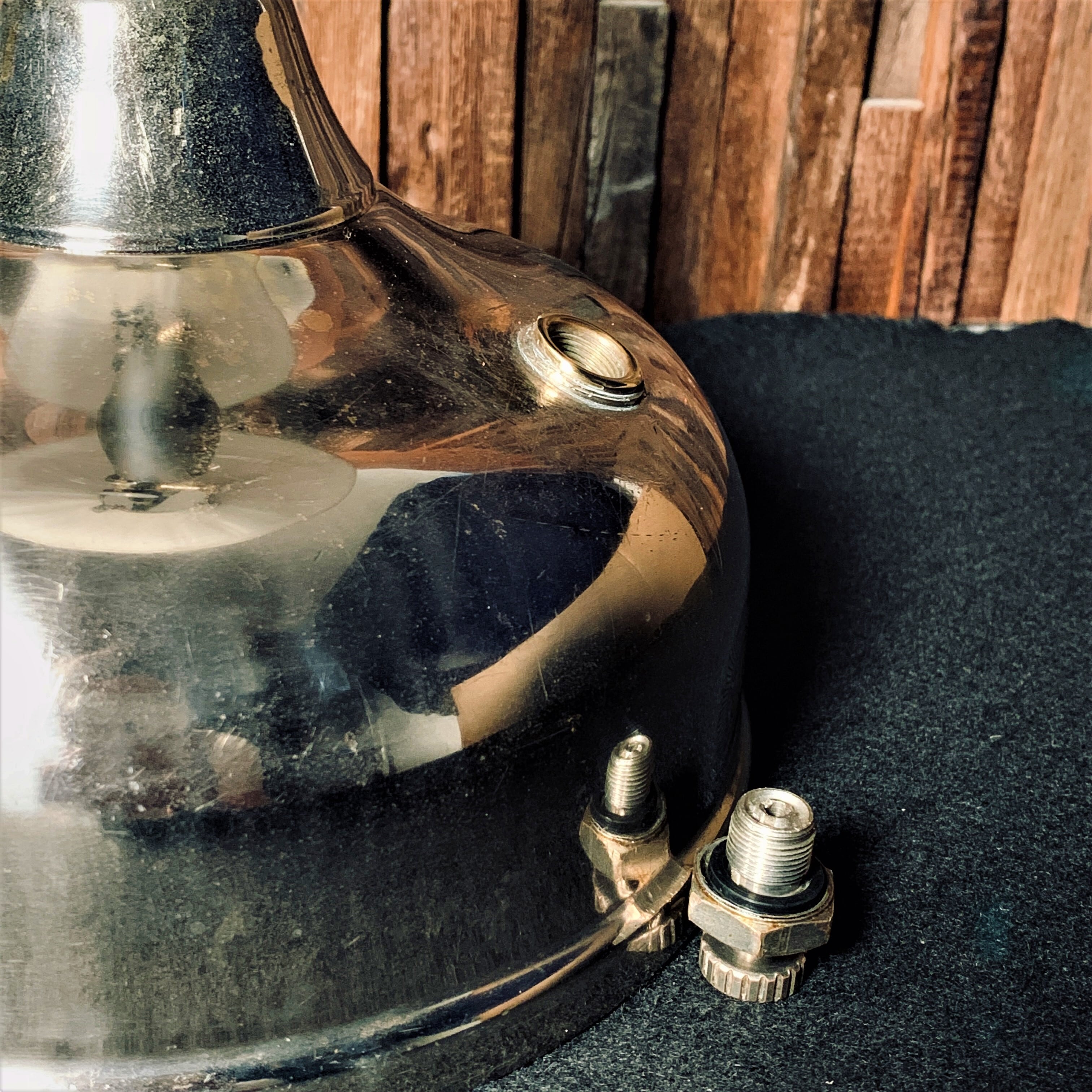 本体のオイルタンクですが、細かく見ますと小キズ、サビ、ヨゴレなどが多少あるものの全体的にキレイな状態です。すべて磨き済みで鏡面仕上げをしていますが、多少のサビ残りがあります。フィラーキャップもサビ落としを行い、エアー漏れもありません。