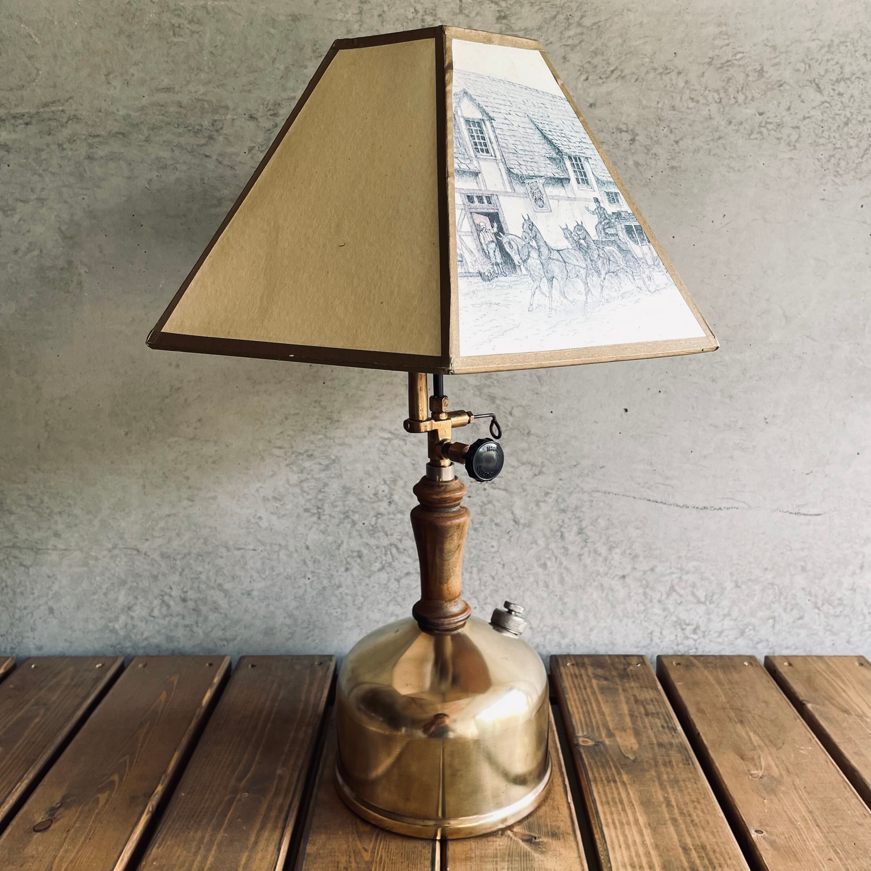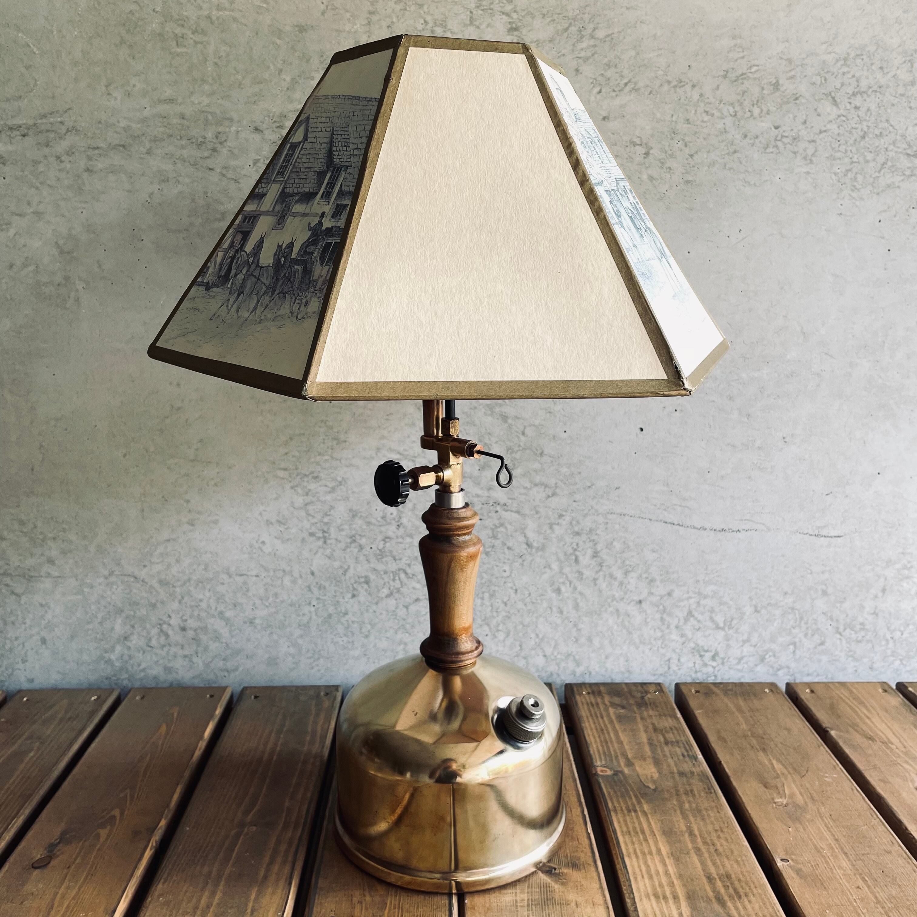 1940年代の134Aに、ビンテージのペーパシェードをセットにしました。丸みを帯びたブラスタンクにセパレートポンプ、ウッドハンドルとビンテージ感満載のテーブルランプにベージュ系にゴールドの枠組みの映えるペーパーシェードとの組み合わせです。