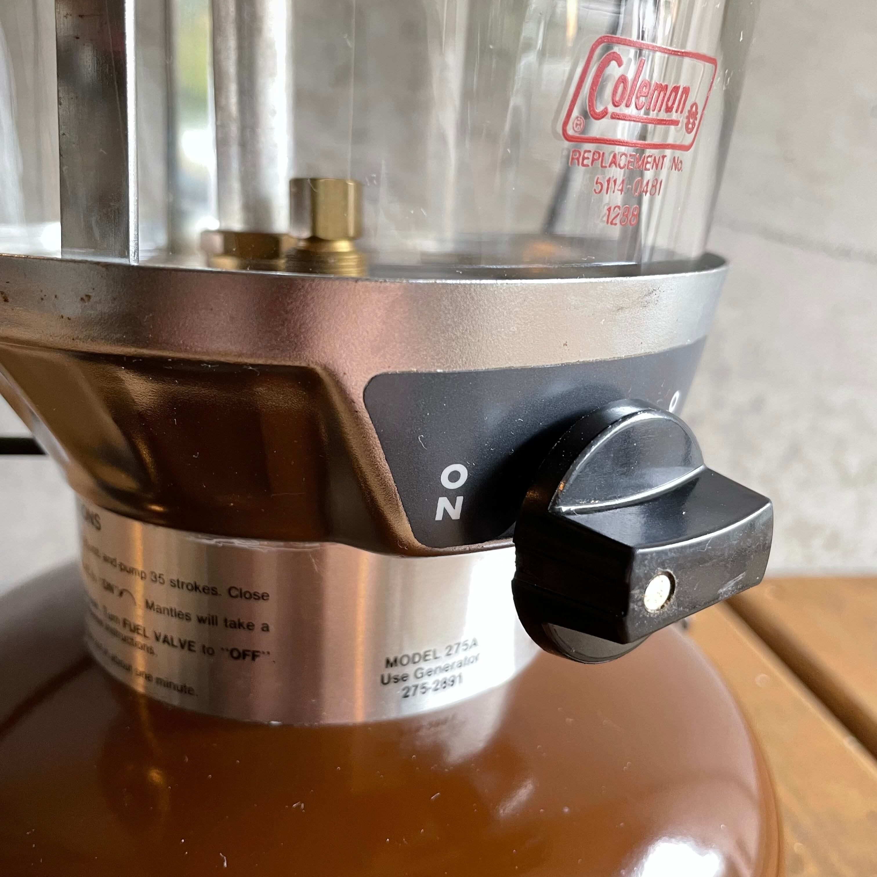 コールマンのビンテージツーマントルランタンの代表モデルと言えば、220系と228系ですが、実は同時期に隠れた名品として275が存在していました。グリーンの220系228系に対してオイルタンク、ベンチレータ共にブラウン、またグローブの形状が台形型という一風変わったデザインに、275の人気の理由があったようです。