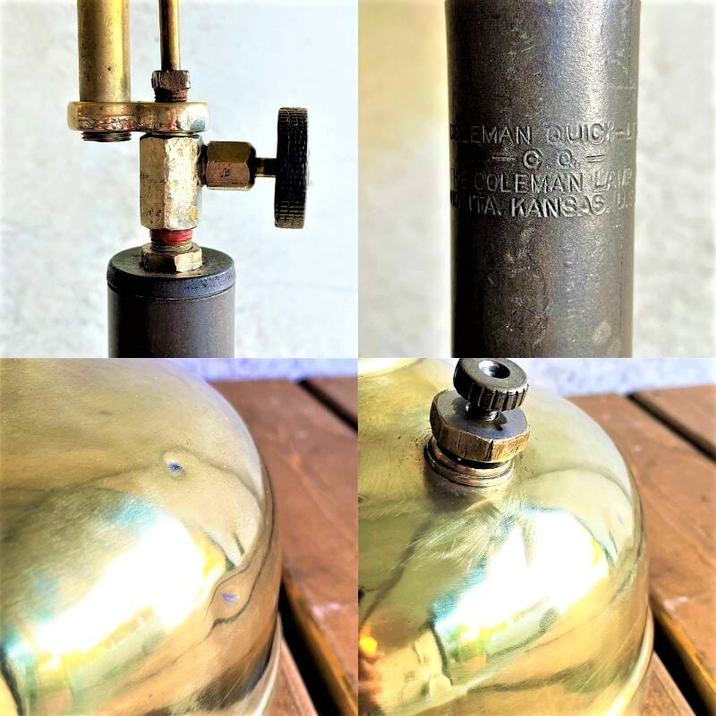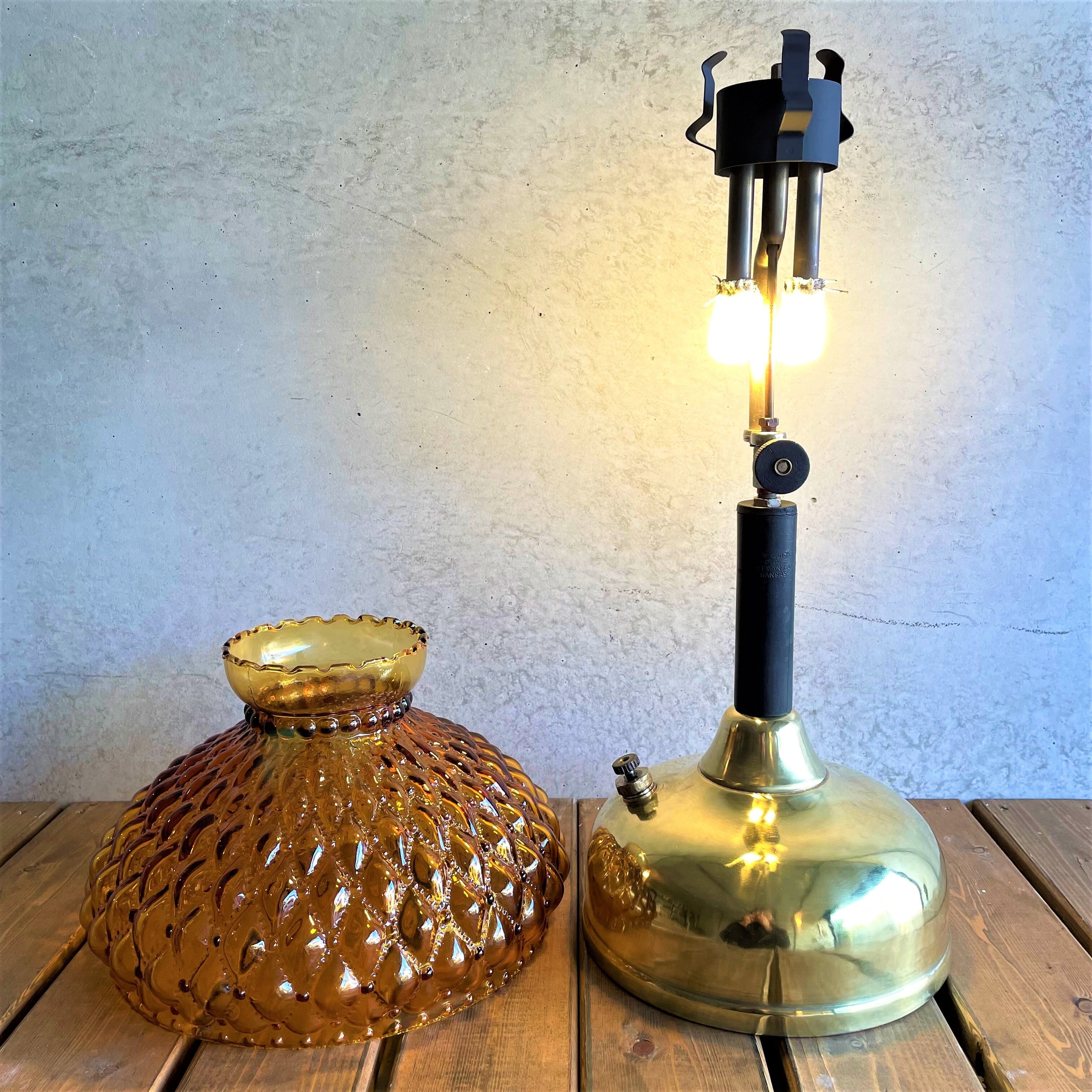 《SP》コールマン CQ クイックライト ビンテージ テーブルランプ 1910年代製造 ブラスタンク ゴールド ホワイトガソリン ダイヤモンド柄アンバーシェード 分解清掃 点火良好 USA製 超美品 SPECIAL