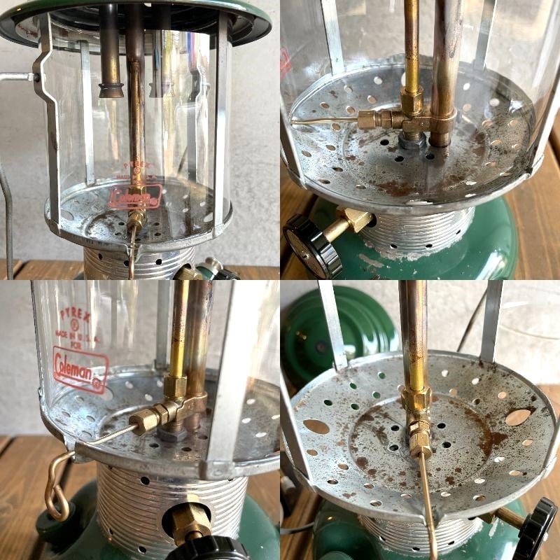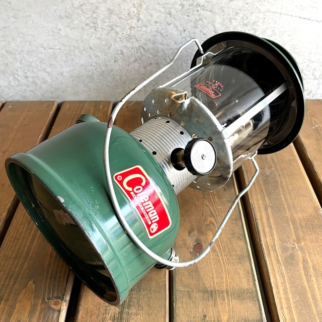 コールマンのビンテージツーマントルランタンの代表モデルと言えば、220系と228系ですが、ビッグハットと呼ばれる大型ツーマントルの228に対して、こちらの220の方が当時は一般的に流通していました。もっとも大きな理由としては積載に際してのコンパクトさと思われますが、ほぼ大きさの変わらないシングルマントルの代名詞200Aに対して、大光量が魅力的なメインランタンとしてツーマントルが人気を博しました。220の長い歴史の中ではアッシーが一新する後期モデルの一つ前、前期最終モデルになります。220Hからバルブアッシーが一体化します。ただベンチレーターは220Fから低い後期モデルになります。アッシーを中心に前期後期を考えるのか、ベンチレーターの高低で前期後期を考えるのか人によって異なるみたいですが、当ショップでは220初期から220Fまでを前期、220Hから220Kまでを後期としています。