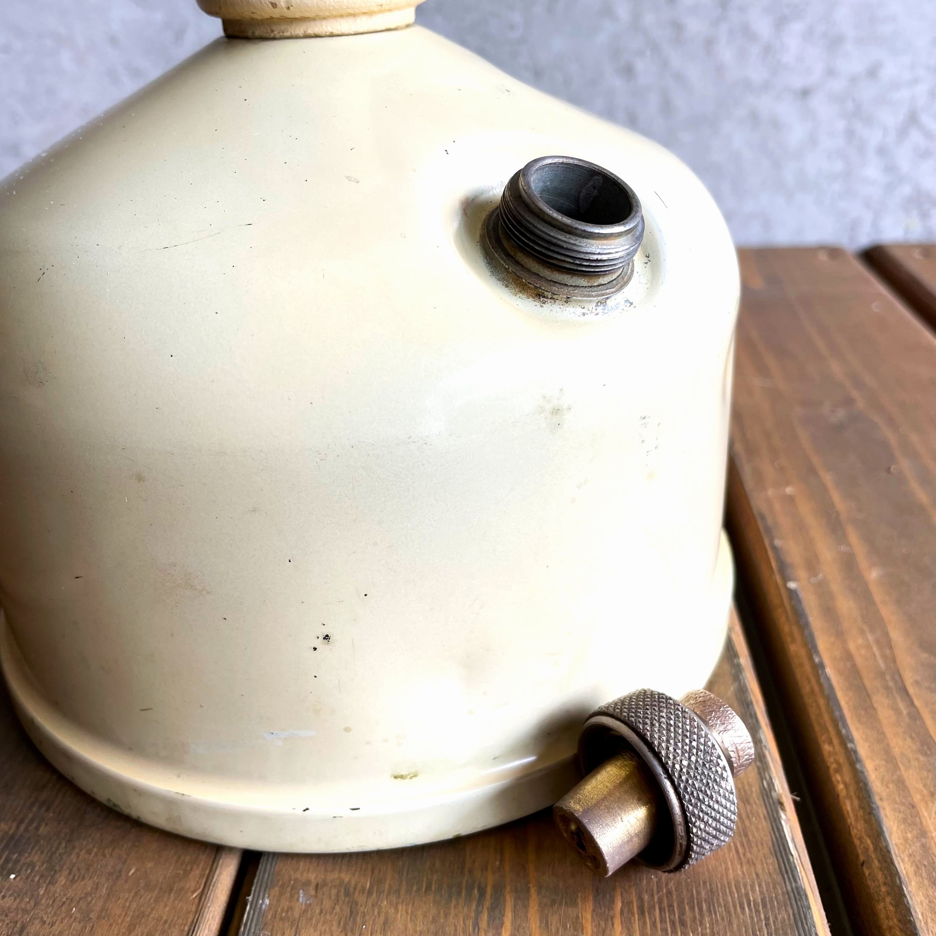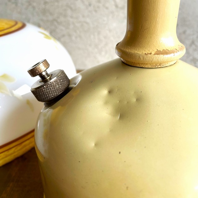 1940年代に製造された134Aテーブルランプに10インチ規格のフラワー柄シェードを組み合わせています。コールマンの小径タンクシリーズはモデルが多岐に渡り展開されていますが、中でもこの134はなかなか見かけないモデルだと思います。フィラータンク上部に淵がなくて全体的に丸みのあるデザインになります。ウッドハンドル、フィラータンク共にきれいなベージュ一色で、底面に製造年月刻印とコールマンロゴがあります。また機関部はもともとクリーニングチップの付くタイプでジェネレーターは220/228/275系が付きます。フィラーキャップは3ピースタイプでセパレートポンプのため別途ハンドポンプが必要ですが、100円ショップなどで販売されているボール用の空気入れなどでも代用できます。