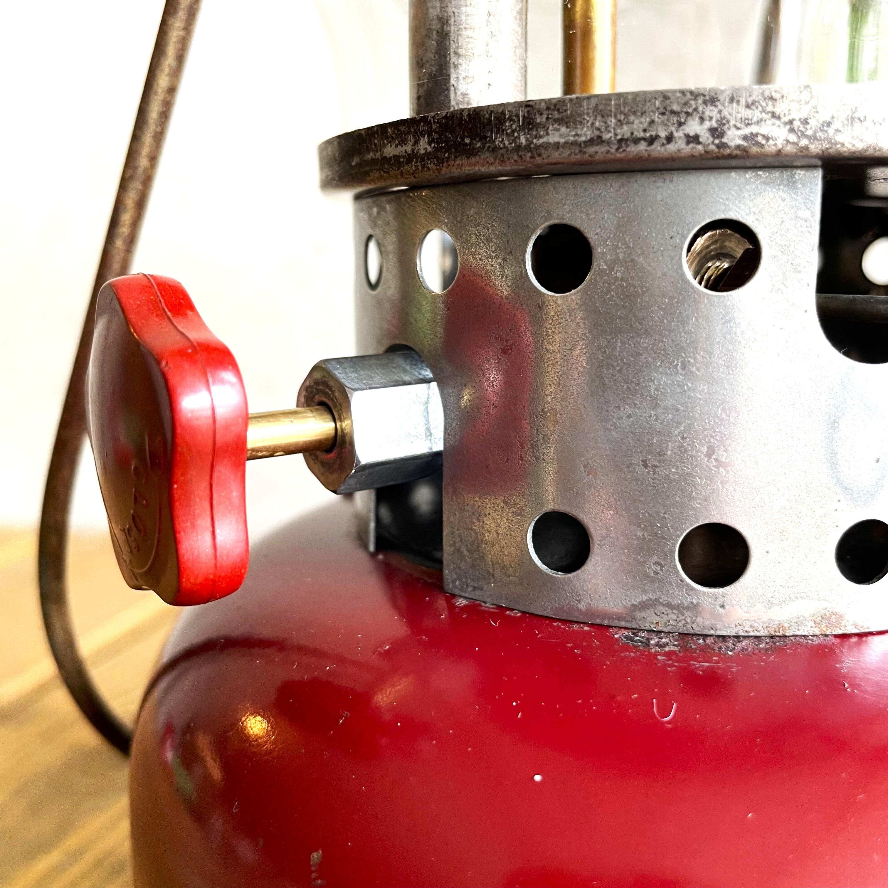 この年代を加味すると全体的に使用感少なくペイントもキレイに残る良好な状態です。すべて細かく分解清掃しています。フィラーキャップのゴムパッキン、バルブ内部のグラファイトパッキンも新品に変えてあります。すでに約80年を経過したランタンですが丁寧にオーバーホールしましたのでまだまだこの先も最前線で活躍してくれると思います。