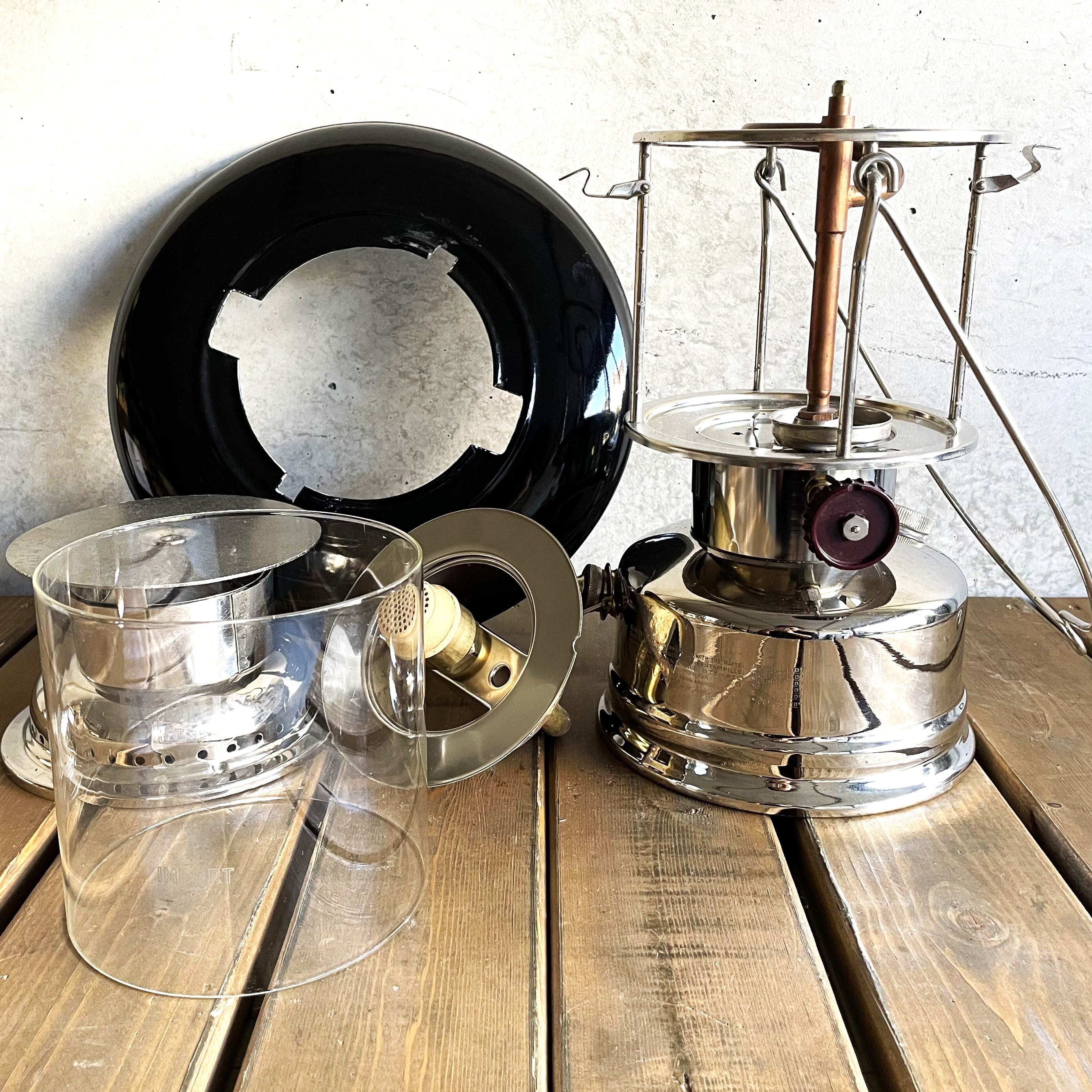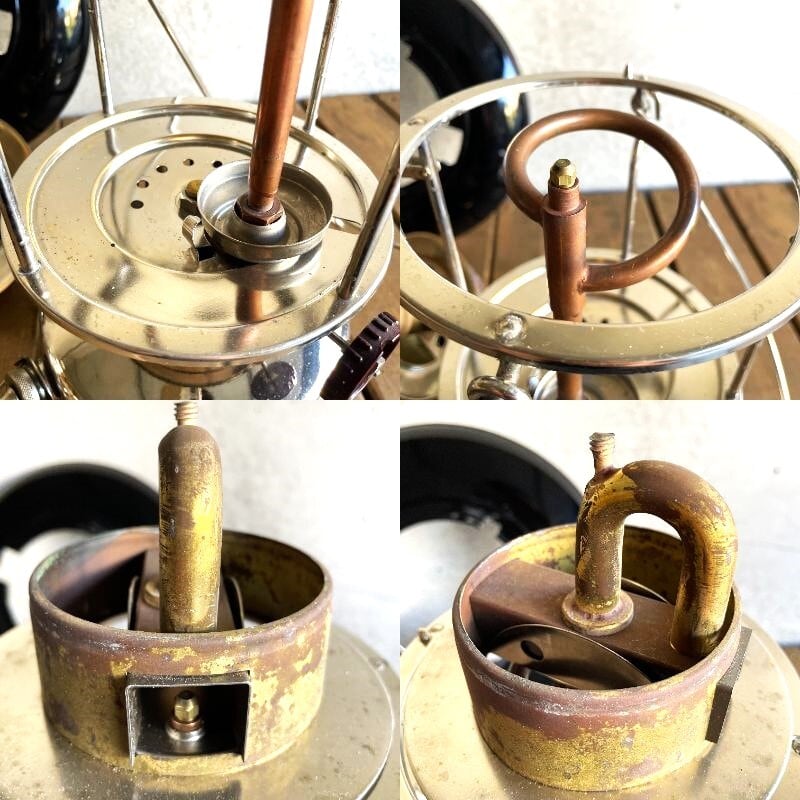 先述の軍用と民間の違いですが、「クックトップ(COOK TOP)」と呼ばれる湯沸かし可能なベンチレーターが軍用、民間は通常の丸みのあるベンチレーター(レッドトップなどと呼ばれます)が特徴です。また当時オプションであった琺瑯製のリフレクターもデッドストックで付属します。その他マントル、純正レンチ、レザーポンプカップ、ゴムパッキンなどメンテナンス関連一式もすべてオリジナルで完備します。